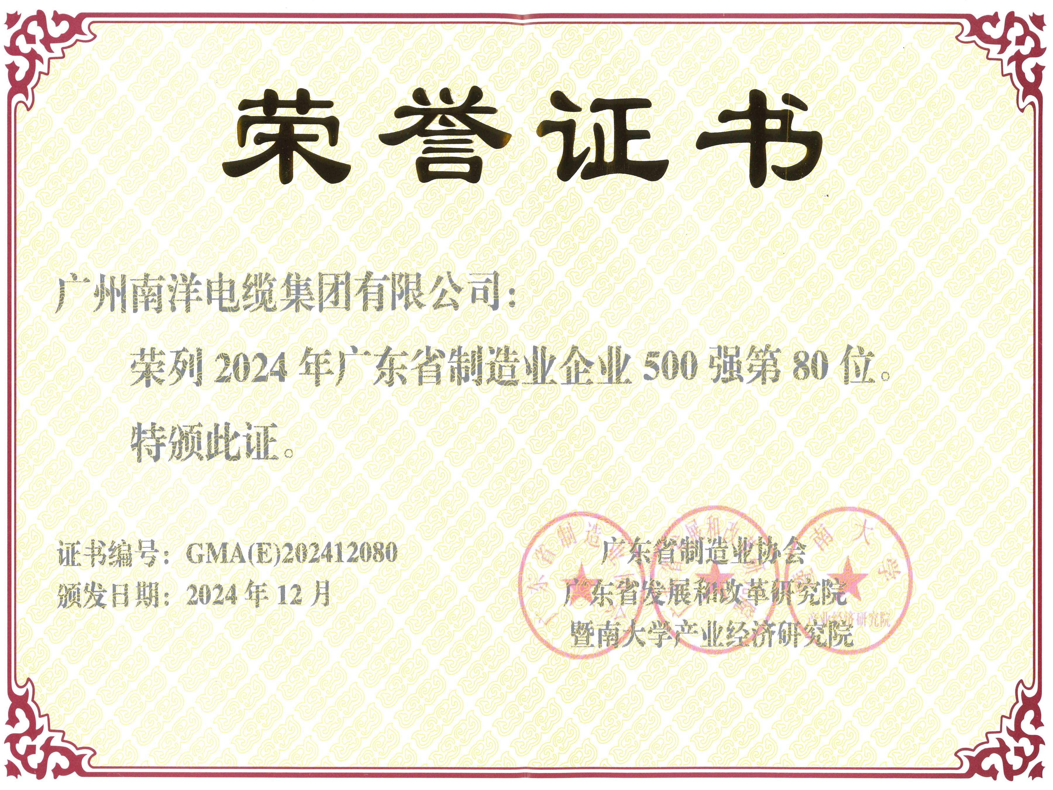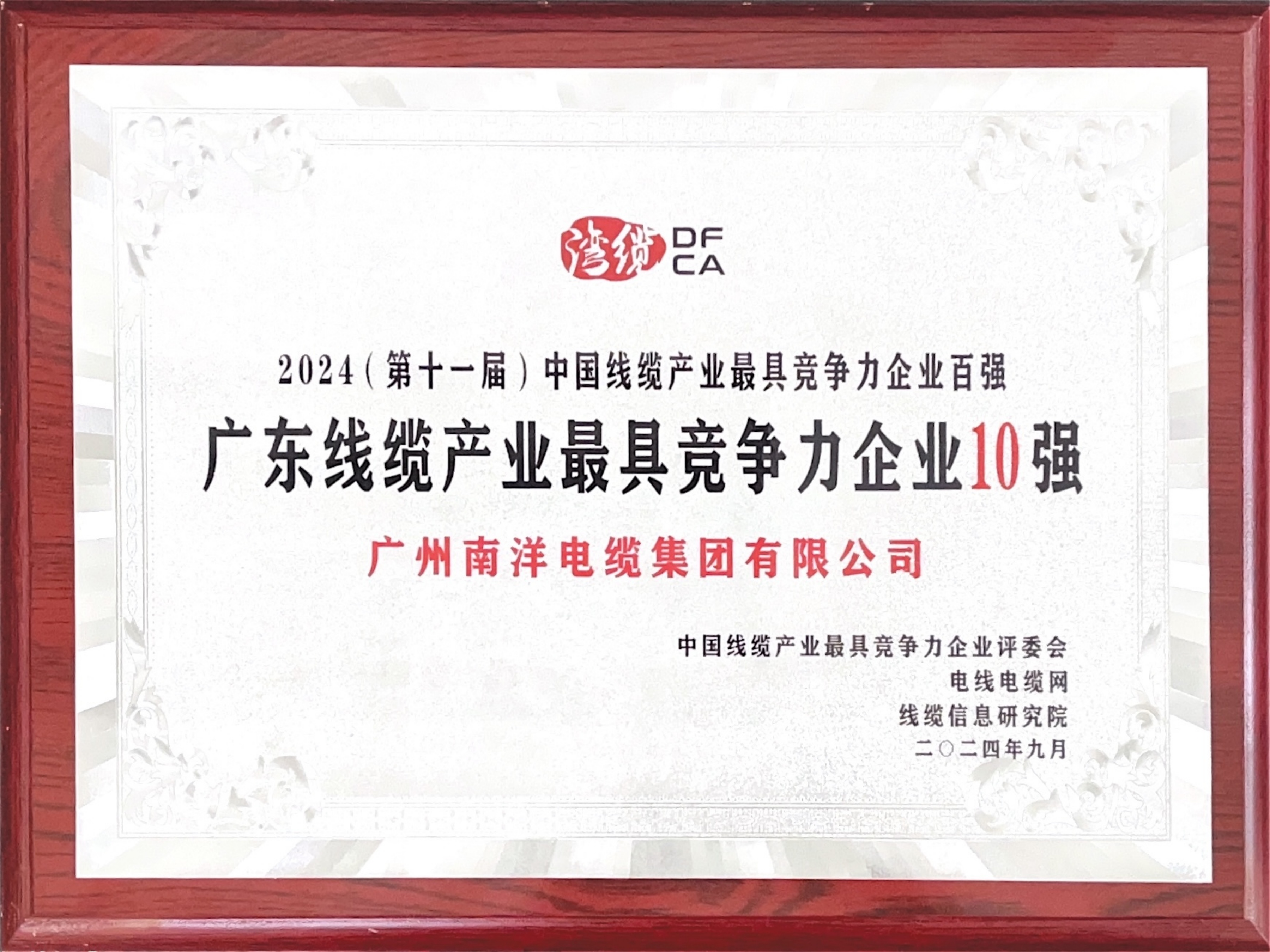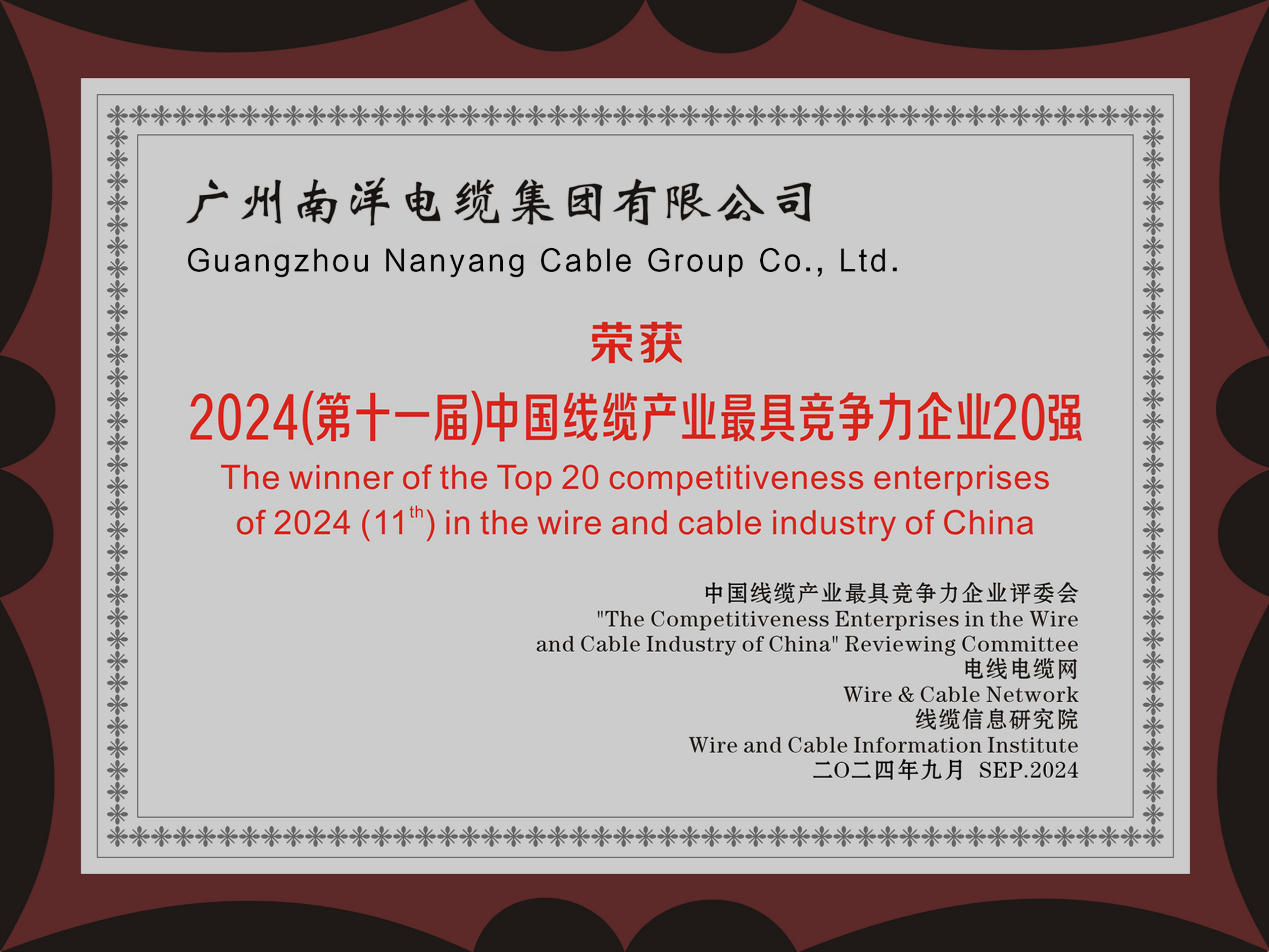 廣東線纜行業最具競爭力企業第一名、中國線纜行業最具競爭力企業20強、華南地區電線電纜研發(fā)制造龍頭企業